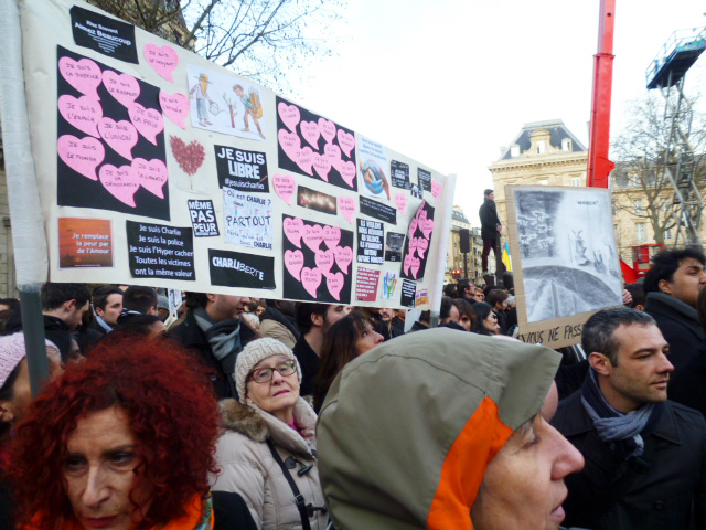 「私はシャルリ-」と書いたワッペンを背中や胸に張った人、プラカードを持った人、鉛筆を髪止めにした若い女性、国旗を持ったグループと、思い思いの自己表現で集まった多くの人達である。国籍も肌の色も、宗教も異なるあらゆる人種が一同に集まり、テロへの反対を訴えた。