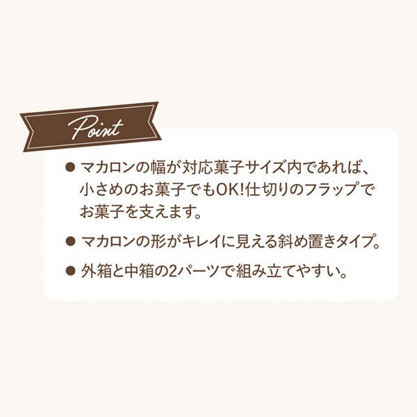 * 外箱・中箱の2点セット。* 外箱材質:A-PET* 中箱の仕切穴サイズ:60×35mm* 対応菓子サイズ:径 約50mm×高 約28mmまで