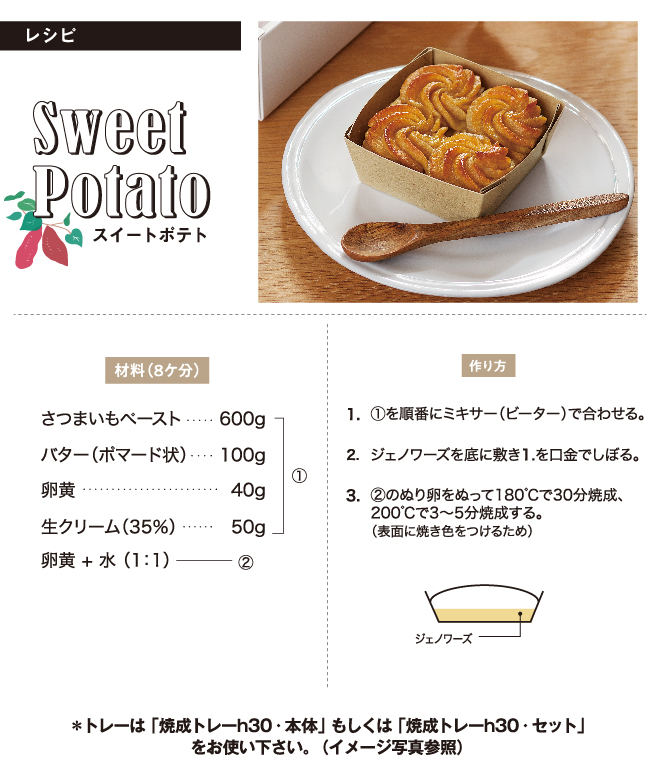 * トレーは内側PET貼りで、直接お菓子を入れて焼成可能です。