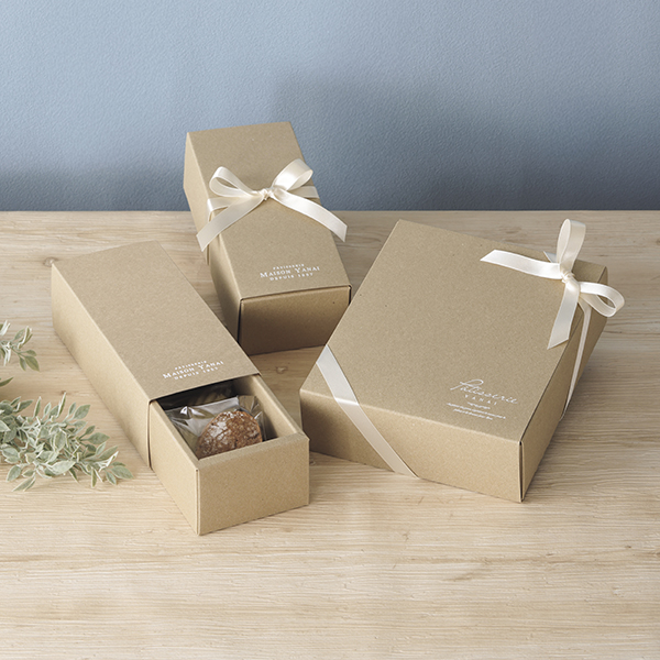 組み立て簡単 スリーブ式ギフトケースギフトペティートシリーズにクラフトが登場。クラフトのナチュラルな質感は焼菓子と相性抜群です。
